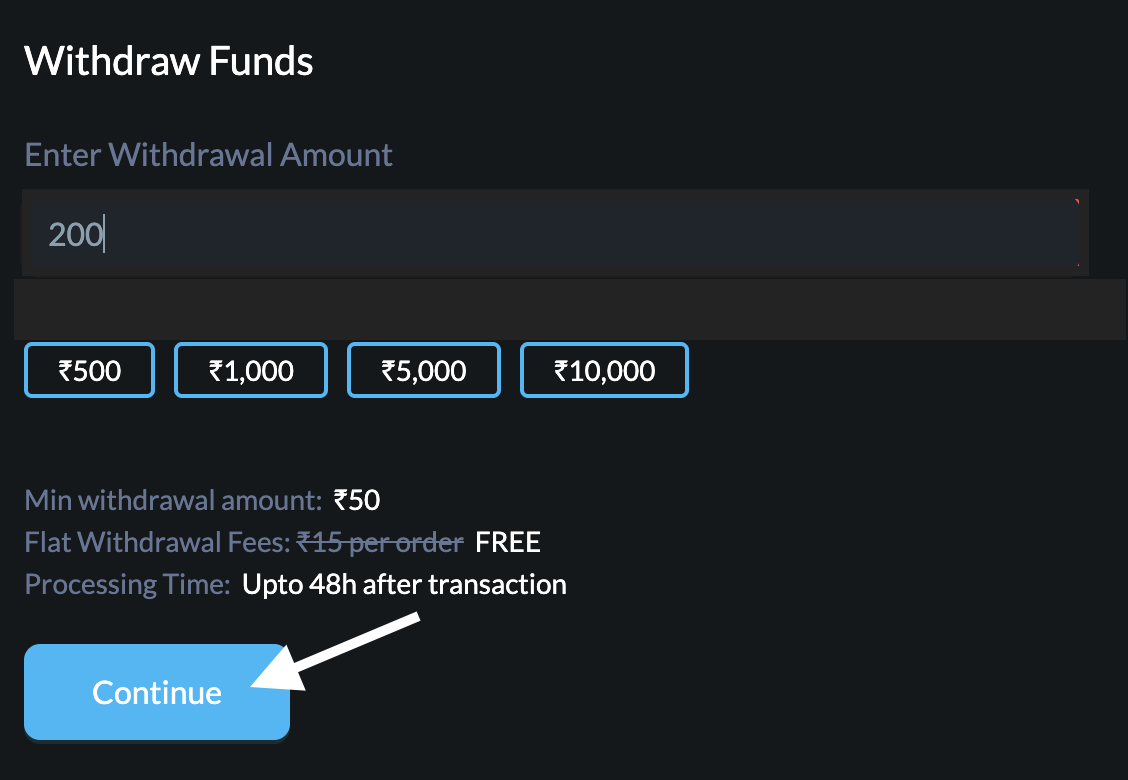 Step 3: Enter the amount that you wish to withdraw and click on continue